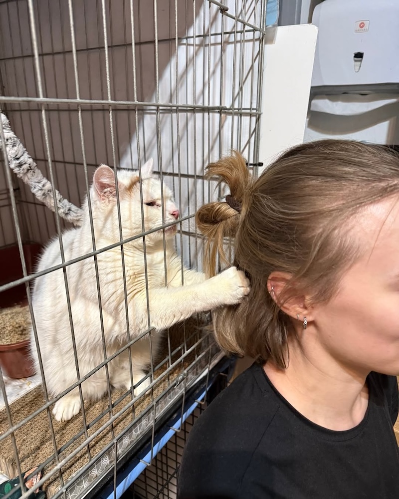 Trafiła do nas w dość dramatycznych okolicznościach. Nasza wolontariuszka była akurat koło Hali Targowej, kiedy zauważyła panią dosłownie ciągnącą kota na smyczy po ulicy. Kotka obijała się o bruk, była osowiała i słabo reagująca. Z obitego noska leciała krew.